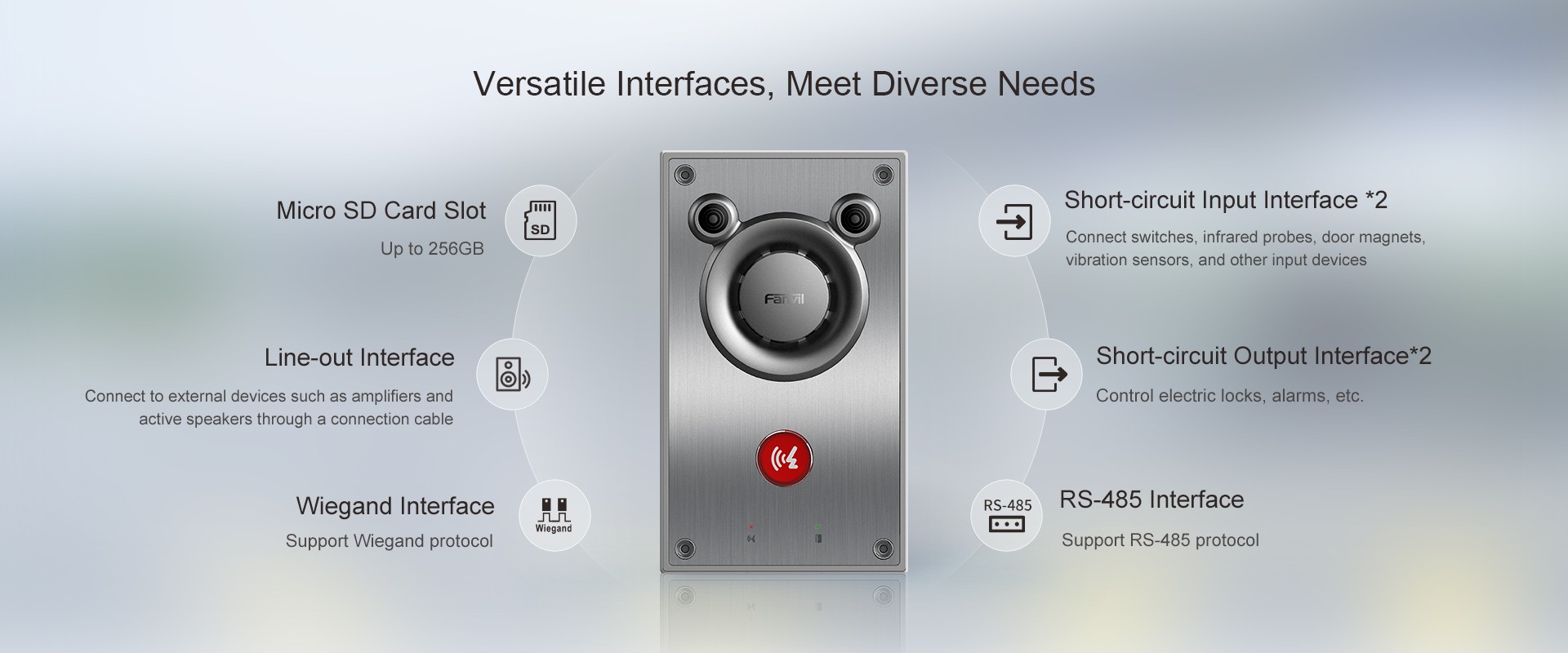 • Interfaces enriquecidas: salida de línea de audio, entrada/salida de cortocircuito, Wiegand, USB, RS485, para satisfacer diversas necesidades