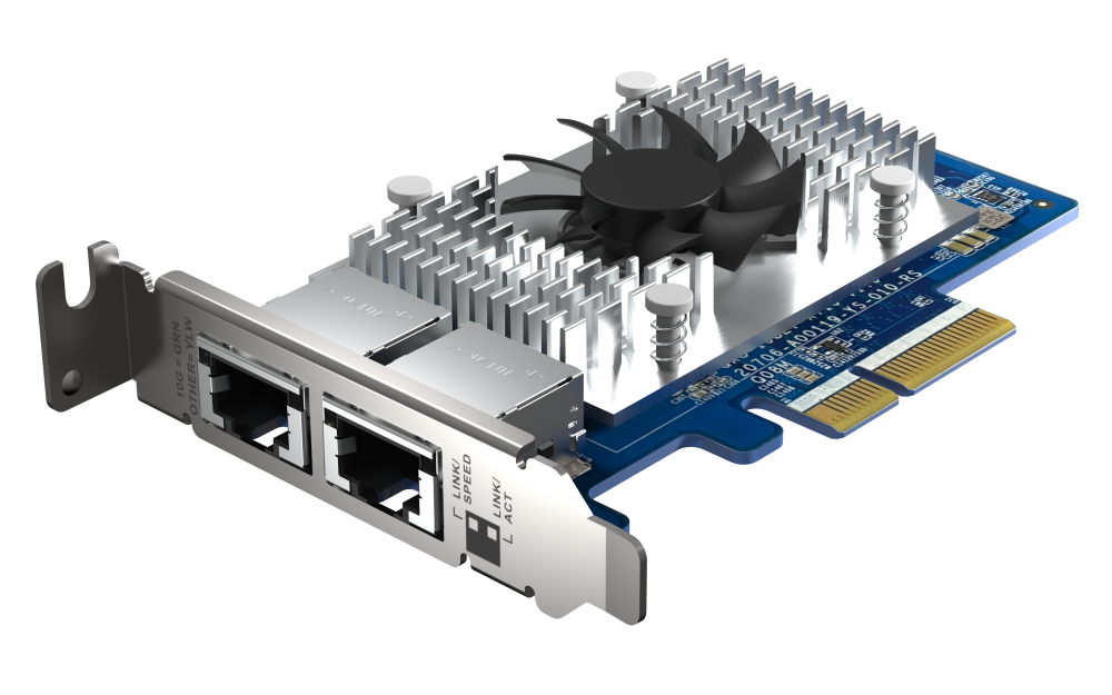 El QXG-10G2T-X710 de dos puertos es una tarjeta de expansión de red 10GbE PCIe Gen 3 (compatible con PCIe Gen 2) con un controlador Intel Ethernet X710 y admite hasta cinco velocidades (10G / 5G / 2,5G / 1G / 100M). Gracias al Enlace troncal de puertos, ambos puertos se pueden combinar para conseguir unas velocidades de transferencia de hasta 20Gbps para acelerar el uso compartido de archivos y la transferencia de datos intensiva. Gracias a la compatibilidad con SR-IOV e iSCSI, el QXG-10G2T-X710 mejora considerablemente la eficiencia de la red y resulta ideal para centros de datos y aplicaciones de virtualización con un uso intensivo de E/S y sensibles a la latencia.
