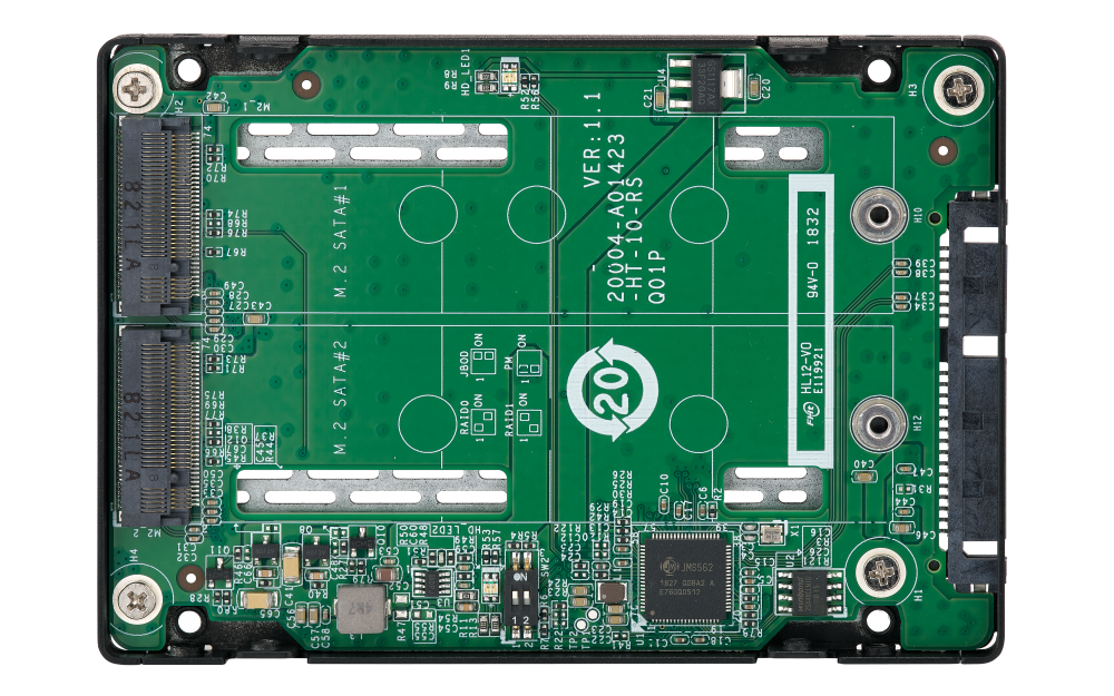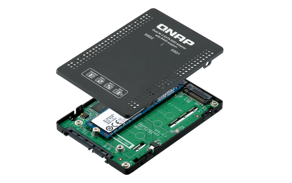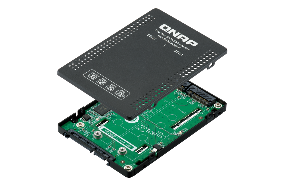 El QDA-A2MAR puede albergar dos unidades SSD SATA M.2 en una única bahía SATA de 2,5". No se necesita ningún controlador de software para el QDA-A2MAR, y se puede instalar en un PC/estación de trabajo (Windows®, Linux®) o en un NAS de QNAP para añadir de forma flexible SSD SATA M.2 de alto rendimiento con configuraciones RAID para responder a diversas necesidades de almacenamiento.