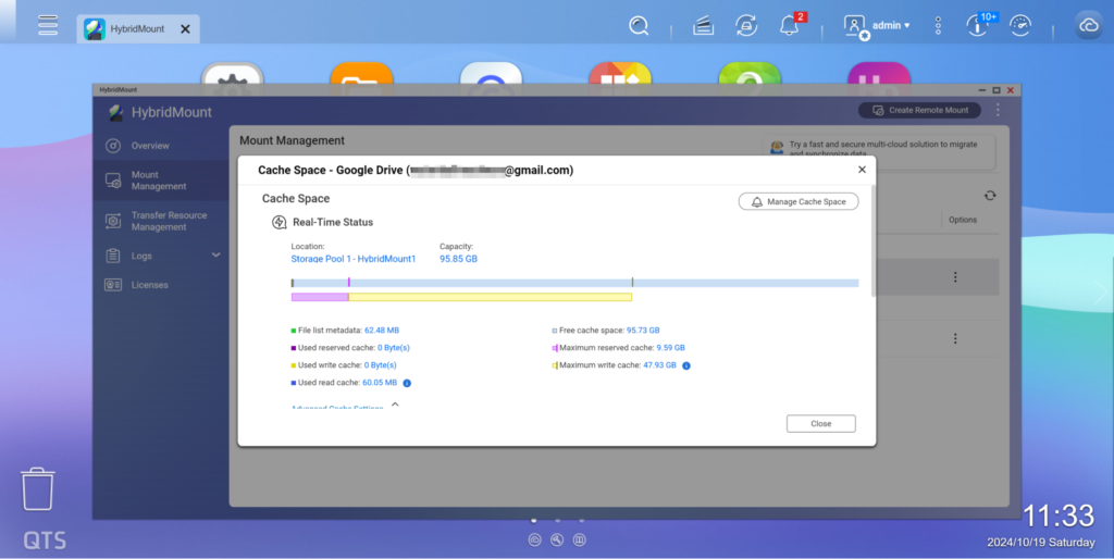 Puedes ver el estado en tiempo real del espacio de acceso rápido en la gestión de montajes y ajustar el tamaño de disco .
