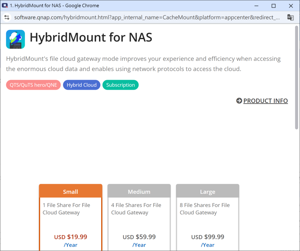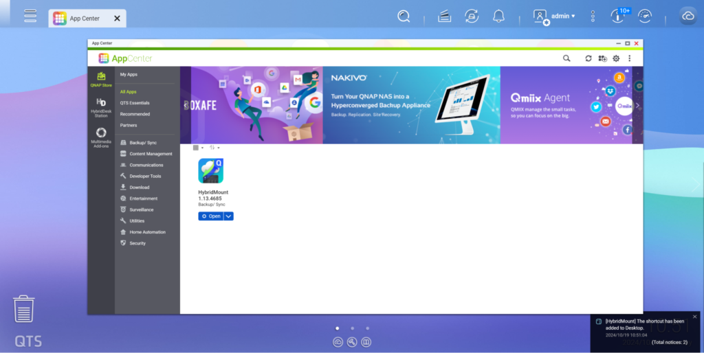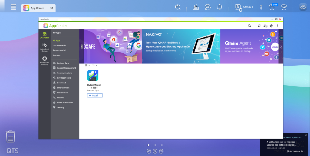 Antes de instalar HybridMount , confirme que el volumen y Configuración del sistema NAS están configurados, y la versión de QTS debe ser 4.4.1 o superior. Al establecer el espacio de acceso rápido HybridMount , se requieren al menos 20GB de Espacio de almacenamiento . Luego vaya a [ App Center ], busque HybridMount y haga clic en [Instalar].