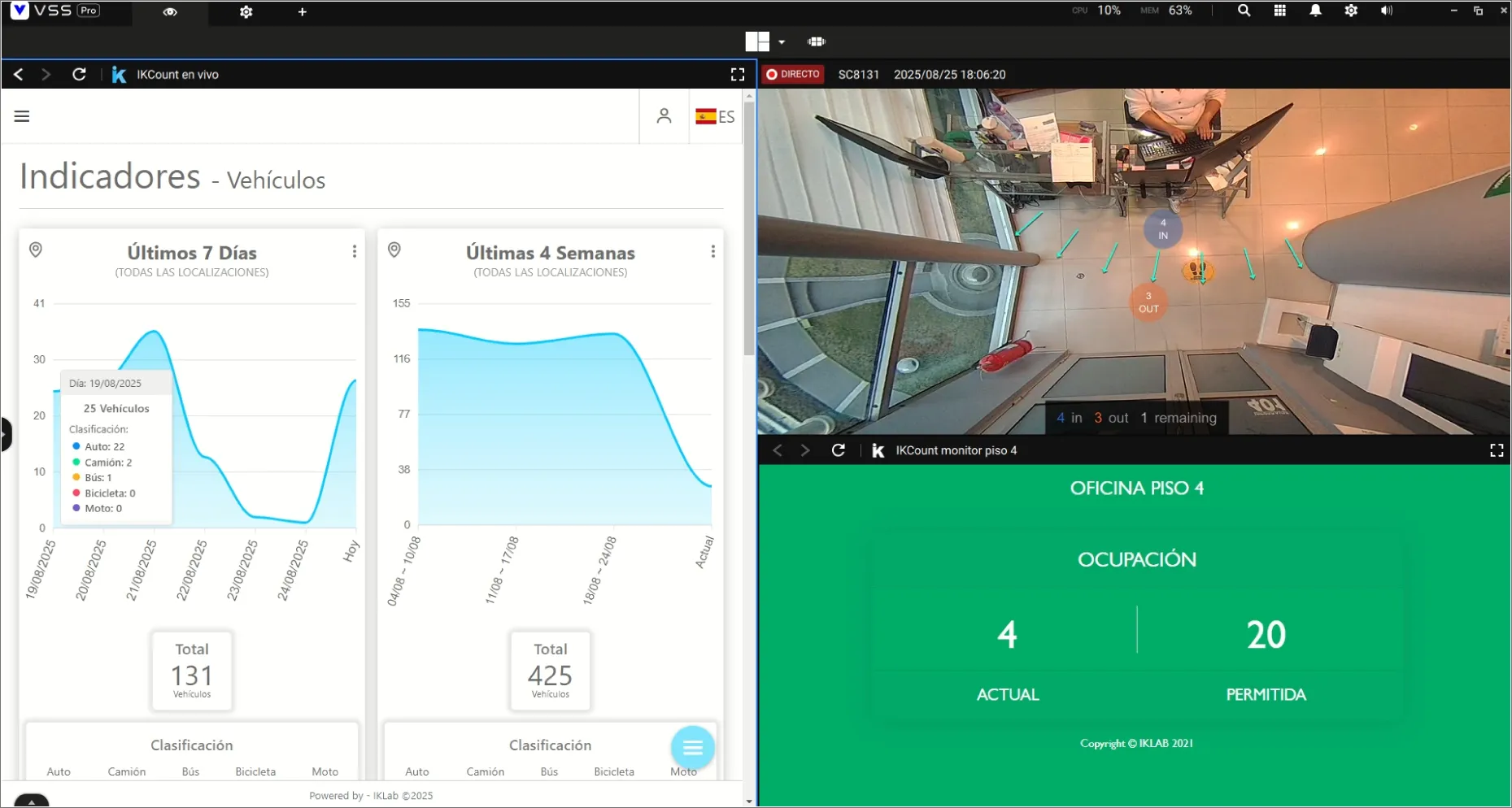 IKCount se integra con VIVOTEK VSS enviando eventos de ocupación en tiempo real a través de Datamagnet para su registro y auditoría, y además proporciona vistas Web embebibles que permiten supervisar continuamente el conteo de personas o vehículos dentro del VSS.