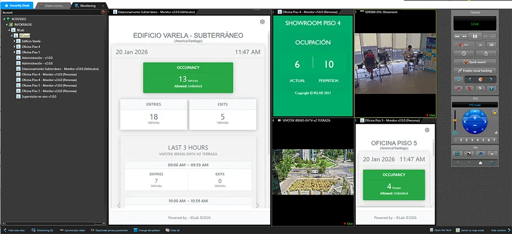 IKCount se integra con Genetec Security Center a través de su Web SDK, enviando alertas de ocupación y generando marcadores de evento para su registro y auditoría. Además, ofrece vistas Web embebibles que permiten a los operadores supervisar en Security Desk, de forma continua, el conteo de personas o vehículos.