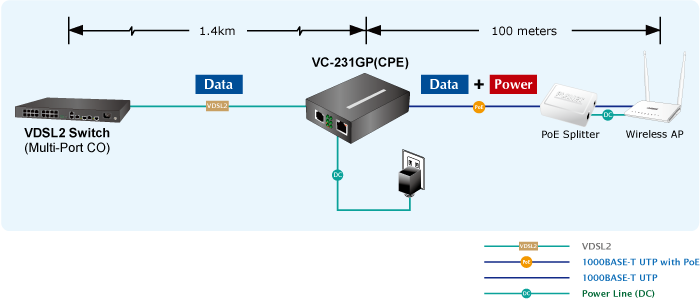 El VC-231GP funciona con convertidores VDSL2 de PLANET o conmutadores VDSL2 de múltiples canales para poder transmitir simultáneamente datos Ethernet a una distancia de hasta 1,4 km (4593 pies) a través de un cable telefónico. El VC-231GP reenvía los datos Ethernet y proporciona una potencia máxima de 30 vatios a través de un cable UTP adicional de 100 m a un dispositivo IP remoto que cumpla con el estándar 802.3af/at PoE PD (dispositivo alimentado) para la implementación de la red. Los usuarios tienen la capacidad de hacer crecer la estructura de las redes actuales de manera sencilla con aún más flexibilidad.