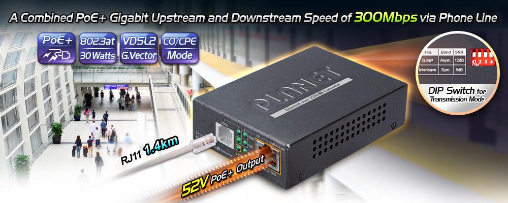 A través de la última tecnología VDSL2, el VC-231GP ofrece capacidad de perfil de banda asimétrico/simétrico seleccionable. Funciona bien con una red de línea telefónica omnipresente con una velocidad de datos simétrica de hasta 150/150 Mbps (G.INP, Sym, 8dB) a una distancia de 300 m y 21/11 Mbps a una distancia de 1,4 km. La serie Gigabit Ethernet sobre VDSL2 de PLANET ofrece la velocidad de transmisión de datos más rápida a través de las líneas telefónicas de cobre existentes sin necesidad de recableado.
