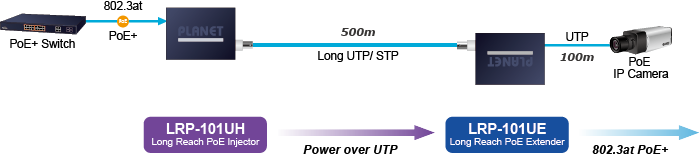 La solución PLANET Long Reach PoE está diseñada para extender la transmisión IP Ethernet e inyectar energía simultáneamente en un dispositivo alimentado (PD) compatible con PoE 802.3af/at remoto más allá del límite de distancia de 100 metros de Ethernet.
