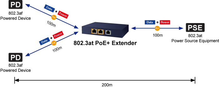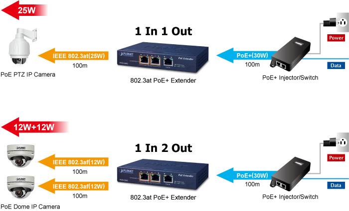 El POE-E202 es muy fácil de instalar con solo enchufarlo y usarlo. Se utiliza entre un equipo de fuente de alimentación (PSE) y un dispositivo alimentado (PD). El POE-E202 inyecta energía al PD sin afectar el rendimiento de transmisión de datos. El POE-E202 ofrece una solución rápida y rentable para duplicar el alcance estándar de PoE de 100 a 200 metros. El POE-E202 está diseñado en una caja compacta que contiene tres puertos RJ45, de los cuales un puerto "PoE IN" funciona como entrada PoE (datos y energía) y los otros dos puertos "PoE OUT" funcionan como salida PoE. El puerto "PoE OUT" también es el inyector de energía que transmite voltaje de CC a través del cable Cat5/5e/6 y transfiere datos y energía simultáneamente entre el PSE y el PD.