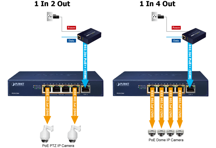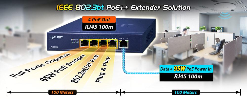 PLANET POE-E304 es un extensor PoE Gigabit de 1 puerto 802.3bt PoE++ de 95 W a 4 puertos 802.3af/at diseñado especialmente para aplicaciones PoE de punto a multipunto. El POE-E304 puede obtener una potencia PoE máxima de 95 vatios del puerto de entrada PoE IEEE 802.3bt y suministra una potencia PoE máxima de 65 vatios a cuatro puertos de salida PoE, lo que extiende la distancia de transmisión simultánea de los datos Gigabit Ethernet y la alimentación IEEE 802.3at/802.3af a través de Ethernet a través del cable UTP Cat. 5/5e/6 estándar de 100 m (328 pies) hasta 200 metros. Por lo tanto, el POE-E304 proporciona una solución sencilla para agregar puertos PoE sin tener que tender más cableado y logra aplicaciones de red más flexibles sin necesidad de un adaptador de alimentación externo.