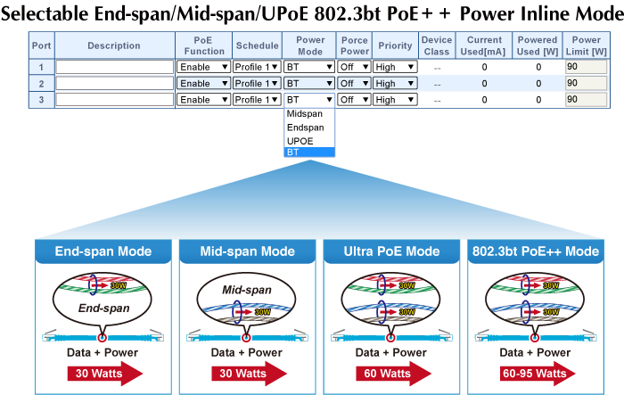 • BT, UPOE, modo de extremo, medio o forzado seleccionable en el modo de salida de energía PoE
