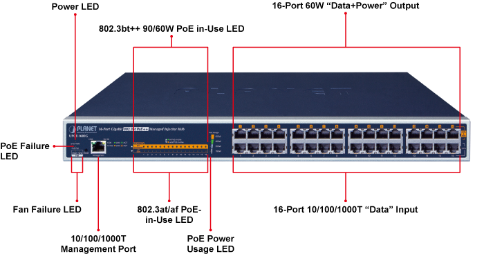 El recientemente mejorado UPOE-1600G de PLANET, un concentrador de inyectores PoE++ 802.3bt administrado de alta densidad y montable en bastidor, cuenta con ocho puertos de inyectores PoE++ 802.3bt tipo 4 de 90 vatios 10/100/1000BASE-T y ocho puertos de inyectores PoE++ 802.3bt tipo 3 de 60 vatios 10/100/1000BASE-T con funciones PoE inteligentes de PLANET a través de una interfaz de usuario web para administración remota. Con un presupuesto PoE total de 600 vatios, ofrece energía PoE ultra a través de cables UTP Ethernet que permiten que los datos y la energía se transmitan simultáneamente a un dispositivo remoto alimentado por 802.3bt/at (PD).