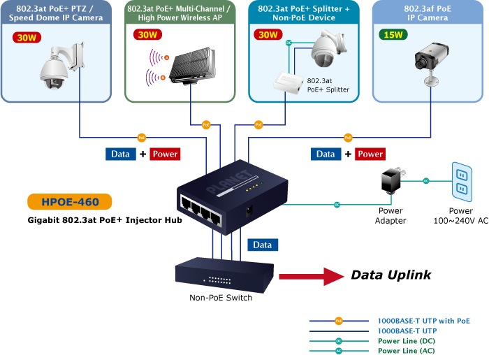 PLANET HPOE-460 es un concentrador inyector PoE+ IEEE 802.3at Gigabit de 4 puertos, que ofrece alimentación por Ethernet Plus (PoE+) IEEE 802.3af e IEEE 802.3at que ofrece hasta 30 vatios de potencia de salida y datos por puerto a través de un cable Ethernet Cat 5e/6. Está diseñado específicamente para satisfacer la demanda de dispositivos alimentados por red que consumen más energía, como cámaras de red PTZ (pan, tilt, zoom)/domo de velocidad, puntos de acceso LAN inalámbricos multicanal (802.11ac/b/g/n/a) y otros dispositivos de red, al proporcionar el doble de potencia PoE, más que el PSE PoE 802.3af convencional.