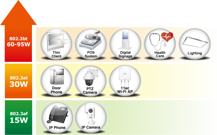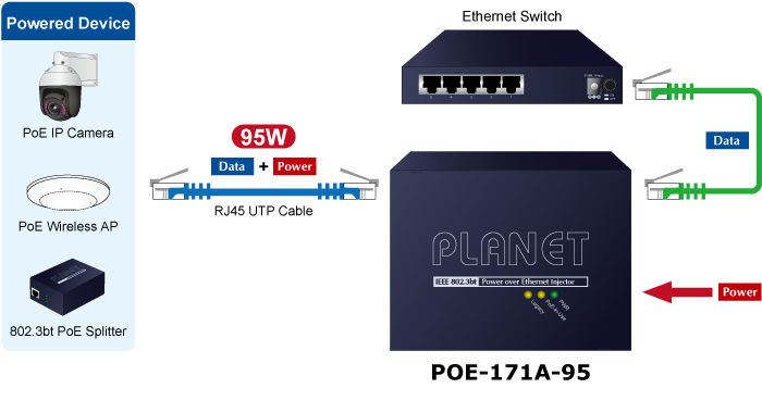 El POE-171A-95 está diseñado específicamente para satisfacer la creciente demanda de equipos de red que requieren mayor potencia, como: