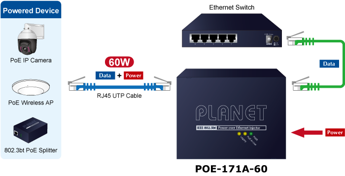 El POE-171A-60 está diseñado específicamente para satisfacer la creciente demanda de equipos de red que requieren mayor potencia, como: