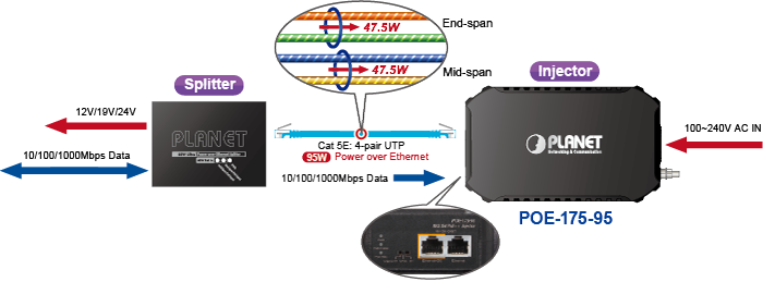 El POE-175-95 entrega los datos digitales Ethernet con una potencia de 54 V CC a través de cables de par trenzado como un inyector de alimentación a través de Ethernet de 95 vatios, y el divisor de alimentación a través de Ethernet ultra conectado, el POE-173S, separará los datos digitales y la potencia en tres salidas opcionales (12 V/19 V/24 V CC) con una distancia de hasta 100 metros.