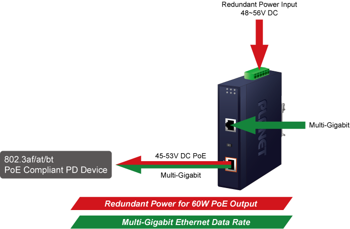 En lugar de suministrar energía a través de UTP trenzado de 2 pares, ya sea en el extremo (pines 1, 2, 3 y 6) o en el medio (pines 4, 5, 7 y 8), el IPOE-171-60W brinda la capacidad de suministrar hasta 60 vatios de energía mediante el uso de los cuatro pares de cableado Ethernet Cat. 5e/6 estándar.