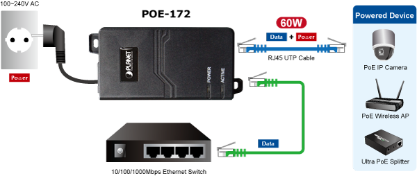 El inyector Ultra Power over Ethernet PLANET POE-172 proporciona una potencia máxima de 60 vatios y una conexión de datos Ethernet de alta velocidad en cualquier lugar de su infraestructura de red. La solución Ultra Power over Ethernet de un solo puerto de PLANET contiene los siguientes productos: