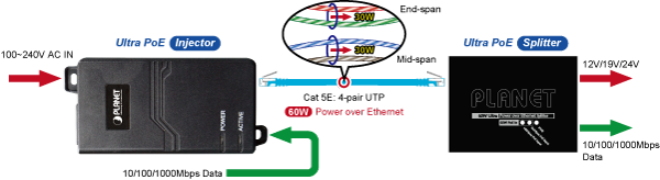 Las soluciones Ultra PoE POE-172 y POE-171S utilizan el mismo estándar de cableado, como IEEE 802.3at/af PoE. En lugar de suministrar energía a través de dos pares de UTP trenzado (ya sea en el extremo del cable (pines 1, 2, 3 y 6) o en el medio del cable (pines 4, 5, 7 y 8), ofrece la capacidad de generar hasta 60 vatios de energía utilizando los cuatro pares de cableado Ethernet Cat. 5e/Cat. 6 estándar. En el nuevo sistema de cuatro pares, se utilizarán dos controladores PSE para alimentar tanto los pares de datos como los pares de repuesto.