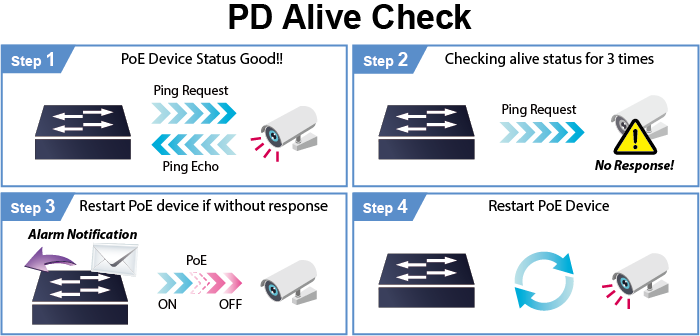 Los productos PoE administrados de PLANET adoptan no solo la tecnología Power over Ethernet, sino también la supervisión automatizada de los dispositivos alimentados y el estado de PoE en tiempo real. El HPOE-1200G se puede configurar para supervisar el estado de los dispositivos alimentados conectados en tiempo real a través de una acción de ping a través del conmutador Ethernet de enlace ascendente. Una vez que el dispositivo alimentado deja de funcionar y responder, el HPOE-1200G reciclará la energía del puerto PoE y hará que el dispositivo alimentado vuelva a funcionar. También mejorará en gran medida la fiabilidad de la red, ya que el puerto PoE restablecerá la energía del dispositivo alimentado, lo que reducirá la carga de gestión del administrador.