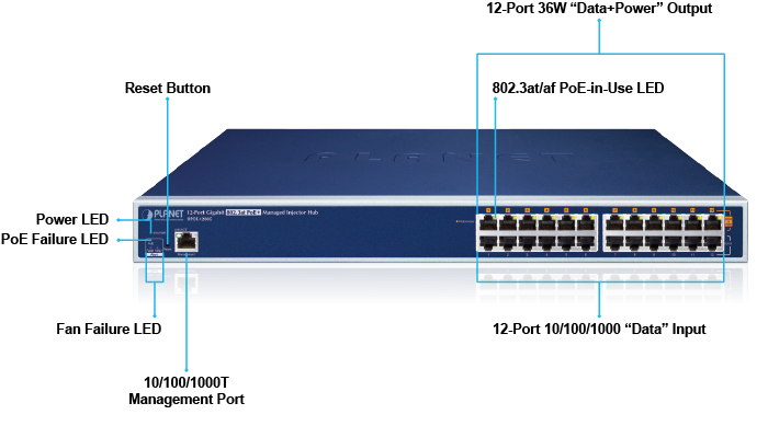 El HPOE-1200G es un concentrador de inyectores PoE+ IEEE 802.3at administrado de alta densidad y montable en bastidor que presenta funciones PoE inteligentes PLANET a través de una interfaz de usuario web para administración remota. Proporciona 12 puertos Ethernet 10/100/1000BASE-T con inyector PoE+ 802.3at con un presupuesto PoE total de 360 ​​vatios. Cada puerto PoE puede suministrar hasta 36 vatios de potencia a través de cables UTP Ethernet Cat.5/5e/6 que permiten que los datos y la potencia se transmitan simultáneamente a un dispositivo remoto alimentado por 802.3at/af (PD).