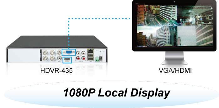 El HDVR-435 proporciona interfaces de salida de video HDMI y VGA para pantallas locales duales, que se pueden conectar a un monitor HDMI o un monitor VGA para monitoreo de visualización en vivo con una salida de video máxima de 1920 x 1080 resoluciones. Debido a la pantalla local, puede eliminar la necesidad de una PC separada para ver el video de la unidad. Además, también se puede operar con el mouse USB para configurar y monitorear todo el sistema fácilmente.