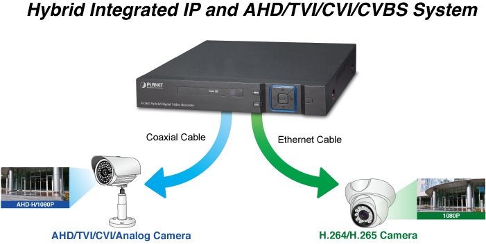 PLANET HDVR-435 es un grabador DVR híbrido H.265 que puede grabar video y datos de cámaras de seguridad tradicionales AHD (alta definición analógica), HD-CVI (interfaz de video compuesto de alta definición), HD-TVI (interfaz de video de transporte de alta definición) y cámaras de seguridad IP de red. La ventaja de una grabadora DVR híbrida es que le permite utilizar el equipo de seguridad analógico instalado actualmente junto con la tecnología IP de red más nueva. Esto le permite actualizar su sistema de vigilancia a equipos IP a su propio ritmo, de acuerdo con su presupuesto.