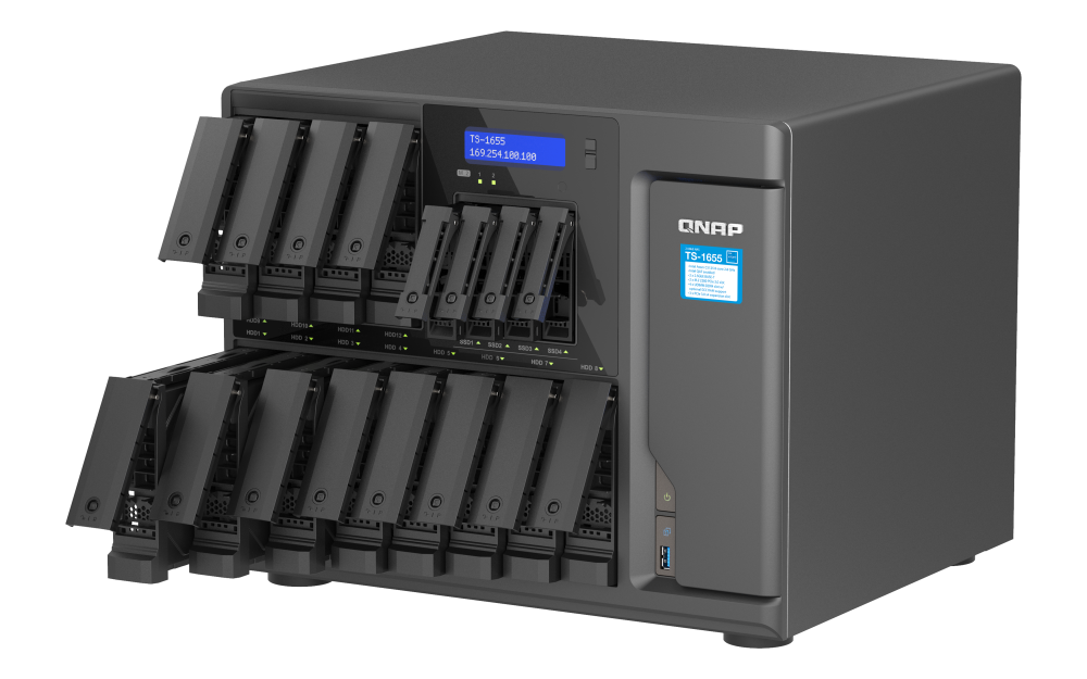 Equilibre el rendimiento y el costo con el almacenamiento híbrido. Diseñado para entornos de TI empresariales diversificados, el TS-1655 de gran capacidad cuenta con doce bahías para unidades SATA de 3,5 pulgadas (para unidades de disco duro) y cuatro bahías para unidades SATA de 2,5 pulgadas (para SSD) con conectividad de alta velocidad de 2,5 GbE. Impulsado por un inmenso procesador Intel de 8 núcleos, el TS-1655 presenta una solución de almacenamiento empresarial segura, escalable y completa para que pueda compartir archivos entre equipos, colaboración, copia de seguridad y recuperación ante desastres, virtualización y transmisión intensiva de datos. El TS-1655 se encontrará disponible y será compatible con QNAP durante un largo período de tiempo (hasta 2030), ideal para empresas que necesitan implementar modelos de NAS coincidentes en varias ubicaciones.