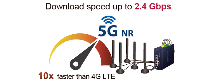 El LCG-300-NR admite velocidades de 5G NR DL (enlace descendente) superiores a 2,4 Gbps y velocidades de 4G LTE DL de hasta 1 Gbps. El ancho de banda de amplio espectro acelera las velocidades de Internet y reduce la latencia de la red para servicios de conectividad premium y sensibles al tiempo. También admite conectividad multibanda, que incluye LTE FDD/TDD, WCDMA y GSM para una amplia gama de aplicaciones.