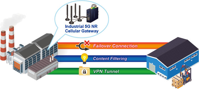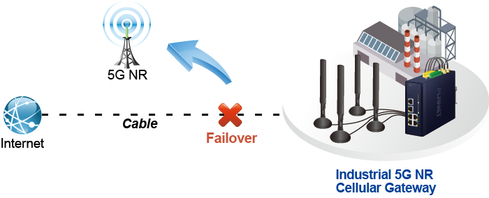 Diseñado con interfaces 5G NR y Gigabit Ethernet WAN, el ICG-2515W-NR garantiza la conectividad a Internet al contar con una funcionalidad de conmutación por error entre 5G NR y GbE WAN. El ICG-2515W-NR brinda flexibilidad para establecer la prioridad para la conexión 5G NR o GbE WAN. Cuando falla la interfaz WAN principal, la interfaz WAN secundaria respaldará automáticamente la conexión para garantizar una conectividad permanente.
