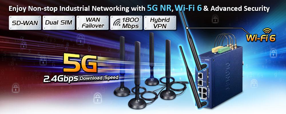 PLANET ICG-2515W-NR es una puerta de enlace celular inalámbrica de grado industrial para aplicaciones móviles exigentes, M2M (máquina a máquina) e implementaciones de IoT. Actualizado a la última tecnología celular de 5G NR (nueva radio), el ICG-2515W-NR puede proporcionar acceso de banda ancha ultrarrápido con red celular 5G. El ICG-2515W-NR también cuenta con cinco puertos Ethernet (4 LAN y 1 WAN), capacidad Wi-Fi IEEE 11ax, puerto serie (RS485), interfaces DI y DO y tecnología VPN, todo en una carcasa de metal compacta pero resistente. Establece una conexión celular rápida entre dispositivos equipados con puerto serie y Ethernet. El ICG-2515W-NR es una solución integrada 5G NR y Wi-Fi 6 para automatización industrial, fábrica digital y otras aplicaciones industriales.
