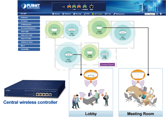 Los VR-300F y VR-300FP proporcionan una gestión centralizada de la serie PLANET Smart AP a través de una interfaz gráfica de usuario web fácil de usar. Es fácil configurar el AP para la SSID inalámbrica, la banda de radio y los ajustes de seguridad. Con un proceso de configuración de cuatro pasos, se pueden entregar simultáneamente diferentes propósitos de perfiles inalámbricos a varios AP o grupos de AP para minimizar el tiempo, el esfuerzo y el coste de implementación.