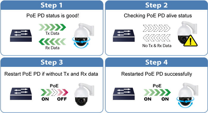 El GS-6311-48P6X puede monitorear el estado del PD conectado en tiempo real a través de la función de comprobación de actividad del PD. Una vez que el PD deja de funcionar y responder, el GS-6311-48P6X reanudará la alimentación PoE y hará que el PD vuelva a funcionar. Mejorará en gran medida la confiabilidad de la red a través del puerto PoE que restablece la fuente de alimentación del PD y reduce la carga de administración del administrador.