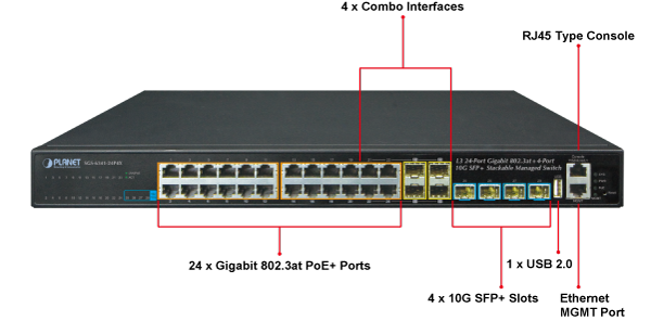 El conmutador Gigabit apilable administrado con PoE de capa 3 PLANET SGS-6341-24P4X ofrece un rendimiento de alta densidad, enrutamiento estático de capa 3, RIP (protocolo de información de enrutamiento) y OSPF (primero la ruta más corta abierta). Con una estructura de conmutación de 128 Gbps, el SGS-6341-24P4X puede manejar cantidades extremadamente grandes de datos en una topología segura que se vincula a una red troncal empresarial o servidores de alta capacidad. Las potentes funciones WRR (Weighted Round Robin) y de seguridad de red hacen que el SGS-6341-24P4X realice un control efectivo del tráfico de datos para ISP y aplicaciones de VoIP empresariales, transmisión de video y multidifusión. El SGS-6341-24P4X tiene 24 puertos IEEE 802.3at PoE+ y un presupuesto PoE de hasta 370 vatios para atender a redes de vigilancia IP o VoIP de escala media a grande a un costo competitivo.