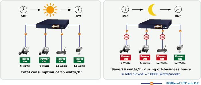 Además de utilizarse para vigilancia IP, el GS-6320-8P2X es sin duda aplicable para construir cualquier red PoE, incluidas VoIP y LAN inalámbrica. En el marco de la tendencia mundial de ahorro de energía y de la contribución a la protección del medio ambiente en la Tierra, el GS-6320-8P2X puede controlar eficazmente la fuente de alimentación, además de su capacidad de proporcionar una gran potencia en vatios. La función "Programación PoE" le ayuda a habilitar o deshabilitar la alimentación de energía PoE para cada puerto PoE durante intervalos de tiempo específicos y es una función potente para ayudar a las PYMES y empresas a ahorrar energía y presupuesto.