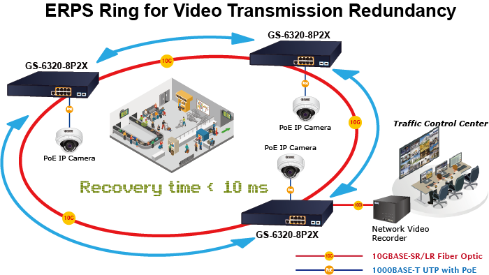 El GS-6320-8P2X admite la tecnología de anillo redundante y cuenta con una capacidad de autorrecuperación rápida y sólida para evitar interrupciones e intrusiones externas. Incorpora la tecnología avanzada ITU-T G.8032 ERPS (Ethernet Ring Protection Switching) y el protocolo Spanning Tree (802.1w RSTP) en la red del cliente para mejorar la confiabilidad del sistema y el tiempo de funcionamiento en entornos hostiles. En una determinada red de anillo simple, el tiempo de recuperación podría ser inferior a 10 ms para que la red vuelva rápidamente a funcionar con normalidad.
