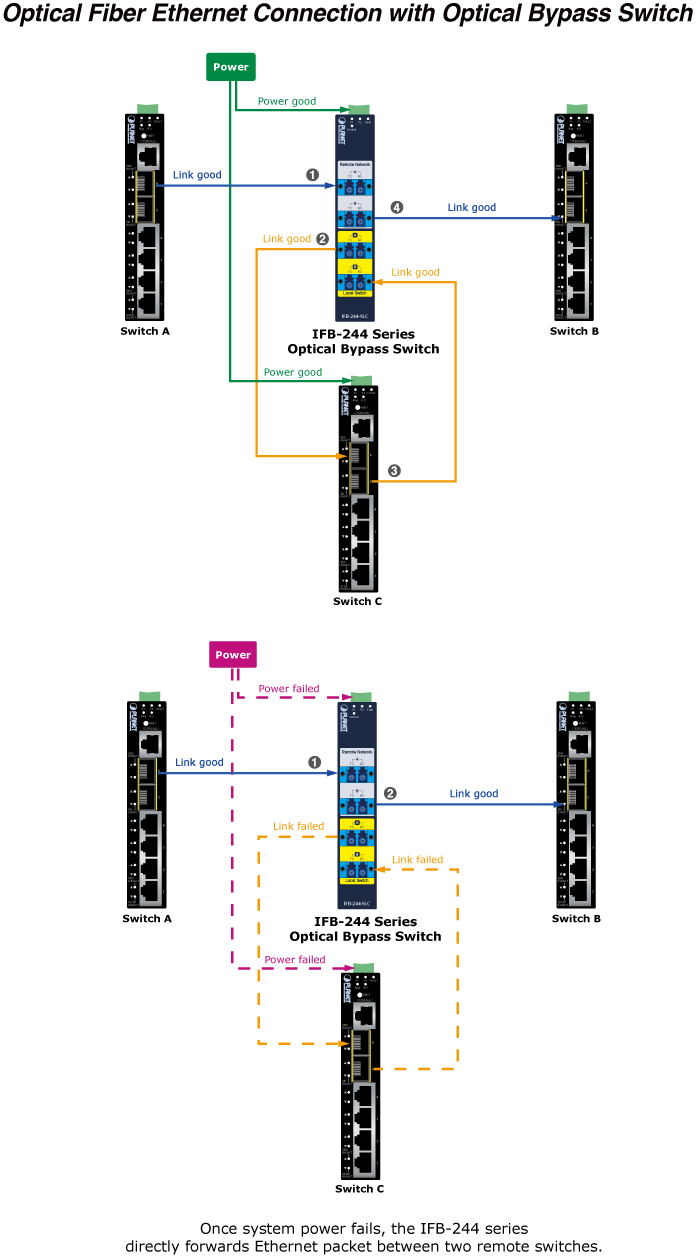 La Serie IFB-244 aplica tecnología de fibra a fibra para lograr pérdidas ultrabajas y un tiempo de conmutación ultrarrápido. Dos de los puertos de fibra se utilizan para conectar a dos conmutadores de fibra remotos y los otros dos puertos de fibra se utilizan para conectar al conmutador de fibra local. La serie IFB-244 y el conmutador Ethernet de fibra local se alimentan desde la misma fuente de alimentación.