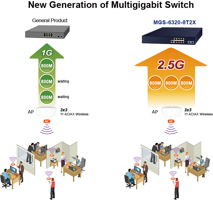 El MGS-6320-8T2X tiene la capacidad de alcanzar una alta velocidad de 2,5 Gbps a través de interfaces de cobre, lo que ayuda a acelerar el rendimiento de la transmisión de datos de gran tamaño. No hay límite de ancho de banda cuando se utiliza el punto de acceso inalámbrico, NAS o computadora de próxima generación con los cables Ethernet CAT5e existentes, lo que reduce los costos y las molestias de recableado. Definitivamente puede brindarle la velocidad que necesita y su Plug and Play hace que la instalación sea fácil.