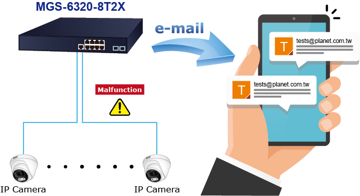 Aunque la mayoría del software de administración de cámaras o NVR ofrece una función de alerta de correo electrónico SMTP, el MGS-6320-8T2X también ofrece una función de alerta de eventos para ayudar a diagnosticar el dispositivo anormal debido a si hay o no una interrupción en la conexión de red.