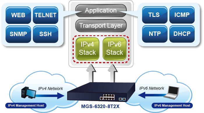 Con soporte para el protocolo IPv6/IPv4 e interfaces de administración fáciles y amigables, el MGS-6320-8T2X es la mejor opción para que los proveedores de servicios inalámbricos, VoIP y vigilancia IP se conecten con la red IPv6. También ayuda a las PYMES a dar el salto a la era IPv6 con la menor inversión y sin tener que reemplazar las instalaciones de red, aunque los ISP establezcan la red de borde IPv6.