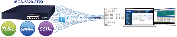 El MGS-6320-8T2X también ofrece funciones de vigilancia DHCP, protección de origen IP e inspección ARP dinámica para evitar ataques de vigilancia IP y descartar paquetes ARP con direcciones MAC no válidas. El administrador de red ahora puede crear redes corporativas de alta seguridad con considerablemente menos tiempo y esfuerzo que antes.
