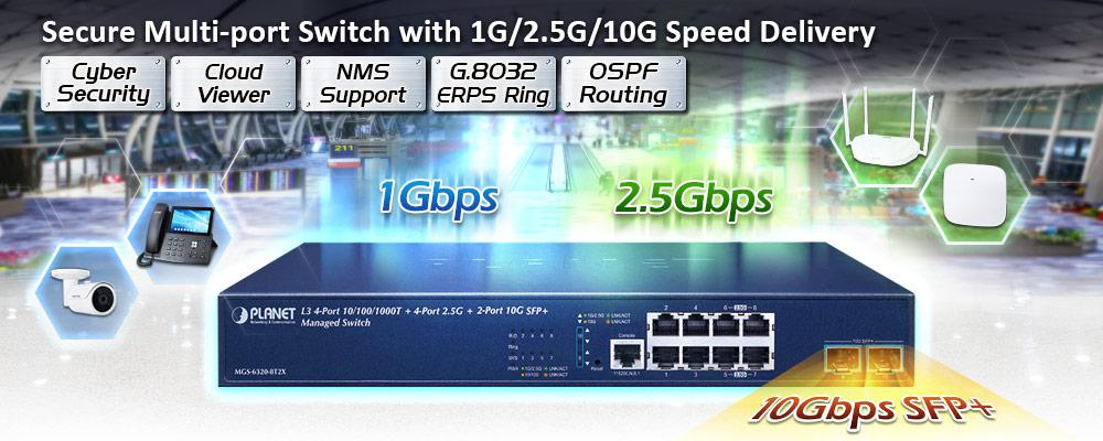 PLANET MGS-6320-8T2X es un switch multigigabit totalmente administrado diseñado para la demanda de equipos de red que requieren un gran ancho de banda, como puntos de acceso inalámbricos Wi-Fi 6 802.11ax, NAS, estaciones de trabajo y aquellos con interfaces 2.5GBASE-T. Cuenta con 4 puertos de cobre 10/100/1000BASE-T, 4 puertos de cobre 100/1000/2500BASE-T y 2 puertos de fibra SFP+ 1G/2.5G/10GBASE-X diseñados de manera flexible para extender la distancia de conexión. Con una capacidad de enlace de datos tan favorable, un rendimiento de enrutamiento de capa 3 basado en hardware, un motor de conmutación de capa 2 y capa 4 e interfaces de administración IPv6/IPv4 avanzadas pero fáciles de usar, ayuda a acelerar la implementación de la próxima generación de IoT y redes inalámbricas para empresas y ciudades inteligentes.