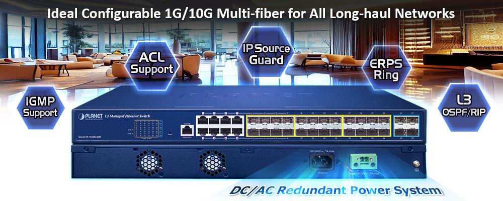 L3 16 puertos 100/1000X SFP + 8 puertos Gigabit TP/SFP + 4 puertos 10G SFP+ Managed Ethernet Switch con alimentación redundante de 36-72 V CC