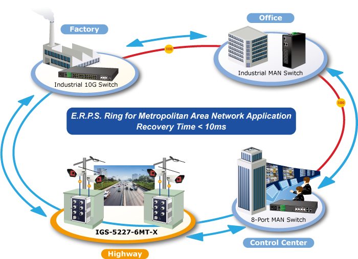 El IGS-5227-6MT-X admite la tecnología de anillo redundante y cuenta con una capacidad de autorrecuperación rápida y sólida para evitar interrupciones e intrusiones externas. Incorpora tecnología avanzada ITU-T G.8032 ERPS (conmutación de protección de anillo Ethernet), protocolo Spanning Tree (MSTP 802.1s) y un sistema de entrada de energía redundante en la red de automatización industrial del cliente para mejorar la confiabilidad del sistema y el tiempo de funcionamiento en entornos industriales hostiles. En una determinada red de anillo simple, el tiempo de recuperación del enlace de datos puede ser de hasta 20 ms.