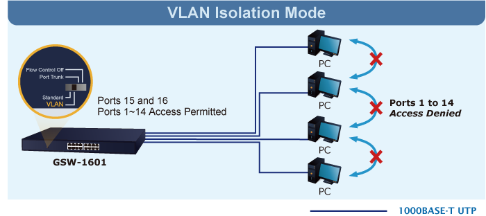 Este modo hace que el GSW-1601 funcione como un conmutador de aislamiento VLAN