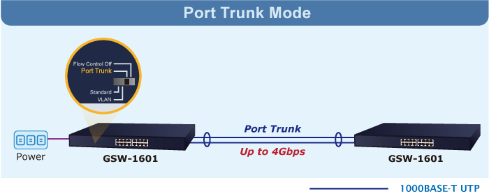 La nueva versión de hardware del GSW-1601 ofrece los modos “Estándar”, “VLAN”, “Troncal de puerto” y “Control de flujo desactivado”.
