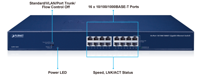 El Switch Gigabit Ethernet GSW-1601 de PLANET ofrece 16 puertos RJ45 de 10/100/1000 Mbps para conectividad de red de alta velocidad. Puede identificar y determinar automáticamente la velocidad de transmisión correcta y el modo dúplex medio/completo de los dispositivos conectados con sus 16 puertos Gigabit que admiten la función de trama jumbo de 9K. Por lo tanto, el GSW-1601 puede manejar cantidades extremadamente grandes de transmisión de datos en una topología segura que se vincula a una red troncal o servidores de alta potencia.
