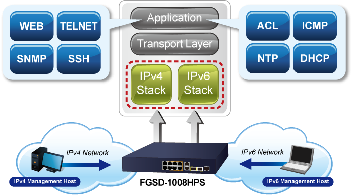 Con compatibilidad con el protocolo IPv6/IPv4 e interfaces de administración sencillas y amigables, el FGSD-1008HPS es la opción ideal para que los proveedores de servicios inalámbricos, VoIP y vigilancia IP se conecten con la red IPv6. También ayuda a las PYMES a ingresar a la era IPv6 con la menor inversión y sin tener que reemplazar las instalaciones de red, incluso si los ISP establecen la red de borde FTTx IPv6.