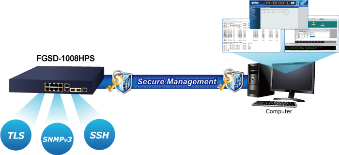 Para una administración eficiente, el FGSD-1008HPS está equipado con interfaces de administración web, Telnet y SNMP. Con la interfaz de administración basada en web incorporada, el FGSD-1008HPS ofrece una función de administración y configuración fácil de usar e independiente de la plataforma. Al admitir el Protocolo simple de administración de red (SNMP) estándar, el FGSD-1008HPS se puede administrar a través de cualquier software de administración estándar. Para la administración basada en texto, se puede acceder al conmutador a través de Telnet. Además, el FGSD-1008HPS ofrece una gestión remota segura al admitir conexiones SNMPv3 que cifran el contenido de los paquetes en cada sesión.