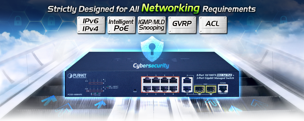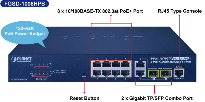 El conmutador administrado PoE+ de capa 2 FGSD-1008HPS de PLANET, recientemente revisado, está diseñado para empresas e industrias donde se puede administrar de forma central una red de PD. Las funciones de administración del conmutador se han mejorado para incluir administración inteligente de PoE, administración de IPv6, ACL, GVRP y más.