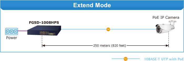 En el modo de funcionamiento "Extendido", el FGSD-1008HPS funciona por puerto a una velocidad de funcionamiento dúplex de 10 Mbps, pero puede admitir la salida de alimentación PoE a una distancia de hasta 250 metros, superando el límite de 100 metros del cable UTP Ethernet.