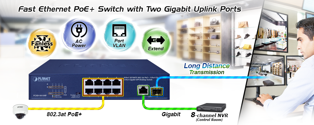 El FGSD-1011HP viene con dos puertos de enlace ascendente con una tasa de transferencia de 1000 Mbps para garantizar la transmisión de datos y video a alta velocidad, una garantía confiable para la conexión entre el sistema de vigilancia y la red externa donde los ocho puertos PoE+ se pueden utilizar a su máximo potencial.